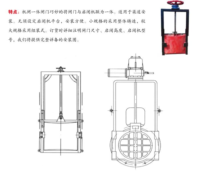 機閘一體式閘門 鑄鐵閘門是一種小型平板閘門,廣泛使用于取水輸水、市政建設(shè),給水排水、農(nóng)田灌溉等工程中,通常設(shè)置在渠道、涵管的進水口,用作工作閘門調(diào)節(jié)流量、控制水位,或用作檢修閘門關(guān)閉孔口擋水。