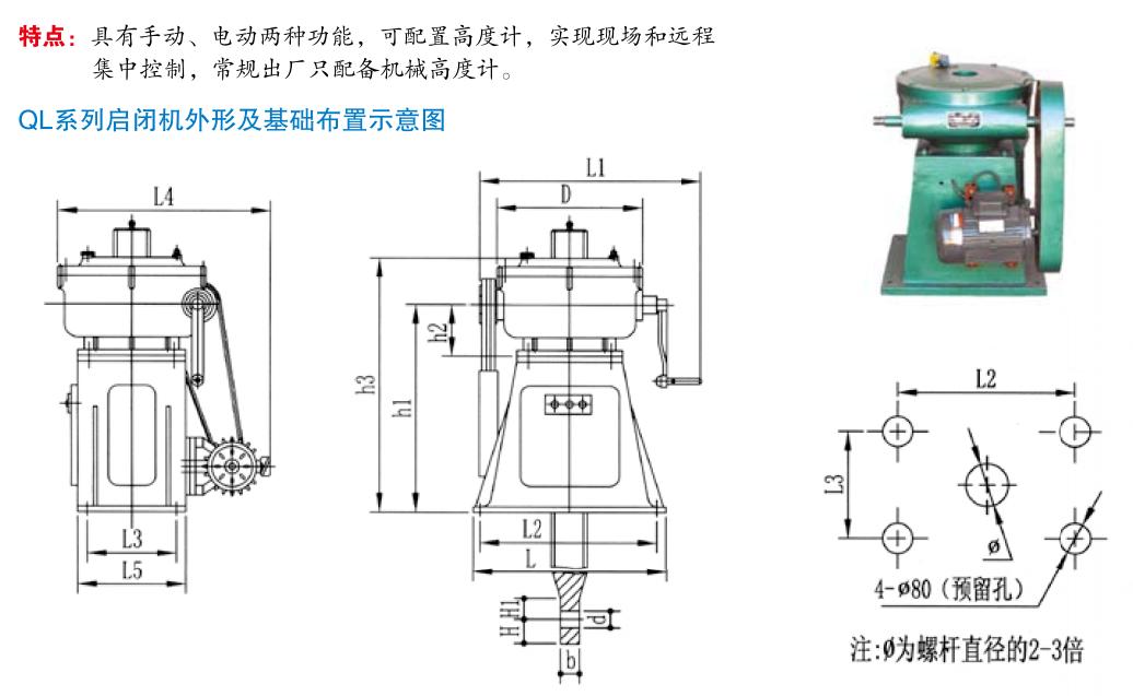QL螺桿啟閉機(jī)系列啟閉機(jī)按吊點(diǎn)數(shù)分為單吊點(diǎn)和雙吊點(diǎn)兩種型號,按驅(qū)動方式分為手動、電動和手電兩用三種形式,一般啟閉容量超過60噸(單機(jī))時(shí)不再配置手動機(jī)構(gòu)。水工機(jī)械廠生產(chǎn)的QL型系列啟閉機(jī)啟門為3KN-650KN,超過650KN(單機(jī))時(shí)可特殊設(shè)計(jì)。